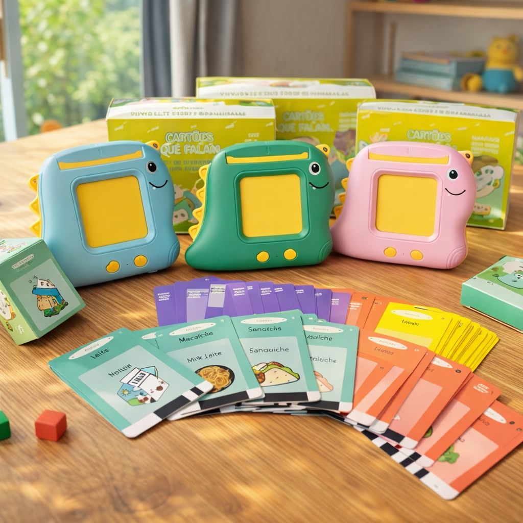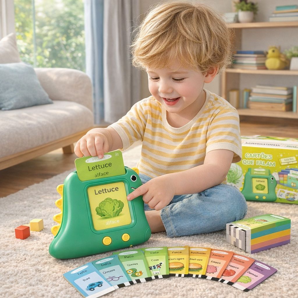 Basta ligar o Dino, inserir um cartão ilustrado e ele faz o resto! 🦖🎶 A criança escuta a palavra em português, depois em inglês e, no caso dos animais, ainda ouve o som característico de cada um, tornando o aprendizado completo e envolvente.